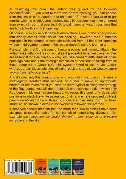 In designing this book, the author was guided by the following considerations. If you want to learn this or that opening, you can choose from dozens or even hundreds of textbooks. But what if you want to get familiar with the middlegame strategy used in positions that have emerged from exactly this or that opening? Or to put it another way: in positions that are typical for this or that opening.Of course, in every middlegame textbook there's one or the other position that clearly comes from this or that opening. However, their number is negligible in the context of example positions from all the other openings whose middlegame treatment the reader doesn't want to learn at all.For example, aren't the issues of hanging pawns and minority attack - the author asks with good reason - just as dispensable for an e4 player as they are essential for a d4 player? - Why should a die-hard enthusiast of Indian openings care about the strategic intricacies of positions resulting from all thosecomplicated Queen's Gambit systems? And of course vice versa: what use are all these subtleties of Indian positions to a player who by nature avoids fianchetto openings?And it's precisely this conspicuous and astounding vacuum in the area of middlegame literature that inspired the author to make an appropriate attempt at improvement: If you want to learn typical middlegame strategy of the Ruy Lopez, you will get a textbook and exercise book in which only Ruy Lopez middlegames are treated. However, this book only deals with positions in which the white pawns on c3, d4 and e4 are opposed by black pawns on e5 and d6 - or those positions that can arise from this basic structure, as shown in detail in the overview following the preface.It deserves special mention that the more than 100 exercises have been assigned to specific topics for the benefit of entertaining diversity - for example the relegation candidate, the only move, violence or pressure increase and the like.