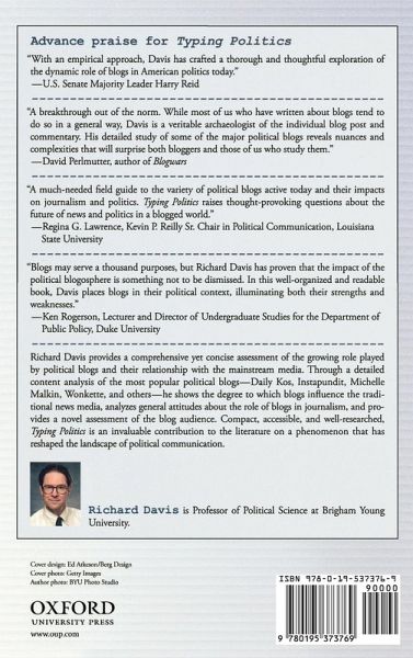 The power of political blogs in American politics is now evident to anyone who follows it. In Typing Politics, Richard Davis provides a comprehensive yet concise assessment of the growing role played by political blogs and their relationship with the mainstream media. Through a detailed content analysis of the most popular political blogs--Daily Kos, Instapundit, Michelle Malkin, and Wonkette--he shows the degree to which blogs influence the traditional news media. Specifically, he compares the content of these blogs to four leading newspapers noted for their political coverage: The Washington Post, The New York Times, The Wall Street Journal, and The Washington Times. He explains how political journalists at these papers use blogs to inform their reportage and analyzes general attitudes about the role of blogs in journalism. Drawing on a national survey of political blog readers, Davis concludes with a novel assessment of the blog audience. Compact, accessible, and well-researched, Typing Politics will be an invaluable contribution to the literature on a phenomenon that has reshaped the landscape of political communication.