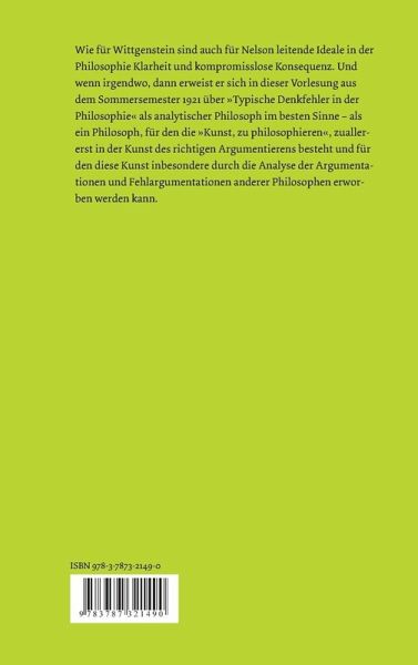 Wie für Wittgenstein sind auch für Nelson leitende Ideale in der Philosophie Klarheit und kompromisslose Konsequenz. Und wenn irgendwo, dann erweist er sich in dieser Vorlesung aus dem Sommersemester 1921 über Typische Denkfehler in der Philosophie" als analytischer Philosoph im besten Sinne - als ein Philosoph, für den die "Kunst, zu philosophieren", zuallererst in der Kunst des richtigen Argumentierens besteht und für den diese Kunst insbesondere durch die Analyse der Argumentationen und Fehlargumentationen anderer Philosophen erworben werden kann.