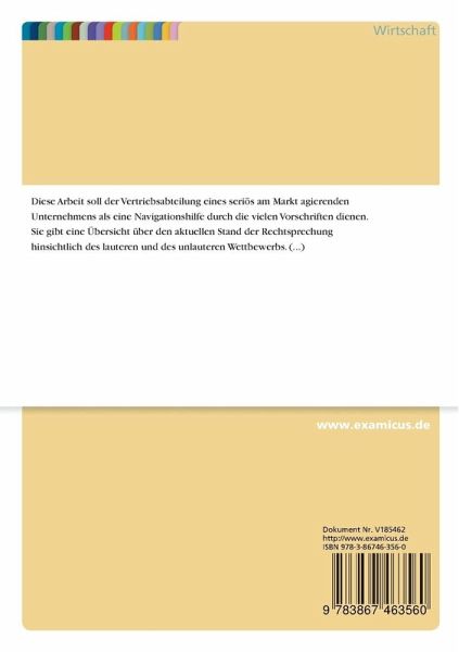 Diplomarbeit aus dem Jahr 2000 im Fachbereich BWL - Handel und Distribution, Note: 1.3, Fachhochschule Kiel, Sprache: Deutsch, Abstract: Diese Arbeit soll der Vertriebsabteilung eines seriös am Markt agierenden Unternehmens als eine Navigationshilfe durch die vielen Vorschriften dienen. Sie gibt eine Übersicht über den aktuellen Stand der Rechtsprechung hinsichtlich des lauteren und des unlauteren Wettbewerbs. Typische unlautere Wettbewerbsmaßnahmen werden zumeist anhand von Beispielen dargestellt und erläutert, mit welchen strafrechtlichen und haftungsrechtlichen Folgen bei Verletzung der entsprechenden gesetzlichen Vorschriften zu rechnen ist. Durch die Arbeit nicht immer erfaßt werden Vertriebsaktivitäten von unseriösen Unternehmen, die von vornherein darauf ausgerichtet sind, auf dem Markt nur durch Rechtsbruch Erfolg haben zu können. Beispielhaft hierfür sollen die verbreiteten Aktivitäten von Kapitalanlagebetrügern sein, die inhaltlich sicher ein interessantes Thema für eine eigenständige Diplomarbeit darstellen würden.