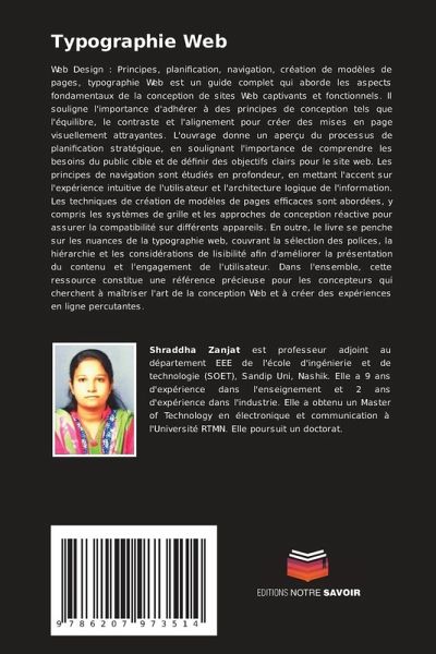 Web Design : Principes, planification, navigation, création de modèles de pages, typographie Web est un guide complet qui aborde les aspects fondamentaux de la conception de sites Web captivants et fonctionnels. Il souligne l'importance d'adhérer à des principes de conception tels que l'équilibre, le contraste et l'alignement pour créer des mises en page visuellement attrayantes. L'ouvrage donne un aperçu du processus de planification stratégique, en soulignant l'importance de comprendre les besoins du public cible et de définir des objectifs clairs pour le site web. Les principes de navigation sont étudiés en profondeur, en mettant l'accent sur l'expérience intuitive de l'utilisateur et l'architecture logique de l'information. Les techniques de création de modèles de pages efficaces sont abordées, y compris les systèmes de grille et les approches de conception réactive pour assurer la compatibilité sur différents appareils. En outre, le livre se penche sur les nuances de la typographie web, couvrant la sélection des polices, la hiérarchie et les considérations de lisibilité afin d'améliorer la présentation du contenu et l'engagement de l'utilisateur. Dans l'ensemble, cette ressource constitue une référence précieuse pour les concepteurs qui cherchent à maîtriser l'art de la conception Web et à créer des expériences en ligne percutantes.