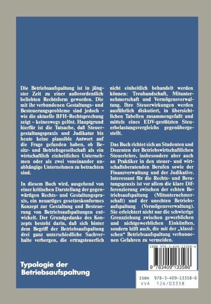 Obwohl es sich bei der Betriebsaufspaltung um eine speziell im mittelständischen Bereich weit verbreitete Rechtsformkonstruktion handelt, die zudem über eine jahrzehntelange Tradition verfügt, ist der Grad an rechtsprechungsbedingter Ungewißheit auf diesem Gebiet besonders hoch. Die zum Teil schon fast dra matischen Rechtssprünge der Judikatur, deren Richtung in der Vergangenheit bereits mehrfach gewechselt hat, haben die Rechtslage so stark kompliziert, daß der Umgang mit der Betriebsaufspaltung in aller Regel ohne Spezialistenrat nicht mehr zu bewältigen ist. Derartige Rechtssprünge sind aber nur deshalb möglich, weil es den Gerichten bis heute nicht gelungen ist, für das von ihnen entwickelte "Rechtsinstitut" der Betriebsaufspaltung ein umfassendes, widerspruchsfreies und dauerhaftes Besteuerungskonzept abzuleiten. Mit der hier vorgelegten Arbeit, die mein angesehener Kollege, Herrn Univ. Prof. Dr. Norbert Herzig, betreut hat und die von der Fakultät für Wirtschafts wissenschaften der Rheinisch - Westfälischen Technischen Hochschule Aachen als Dissertation angenommen wurde, hat Wolfgang Kessler es mit Erfolg unter nommen' ein gesetzlich fundiertes, geschlossenes und tragfähiges Konzept für die Gestaltung und Besteuerung von Betriebsaufspaltungen zu deduzieren. Ausgehend von einer differenzierten Analyse der Sachverhaltsebene und der dogmatisch überzeugenden Erkenntnis, daß jede Betriebsaufspaltung zu einer (Teil-) Übertragung von Einkunftsquellen führt, weist der Verfasser nach, daß sich hinter dem Schlagwort "Betriebsaufspaltung" drei ganz unterschiedliche Sachverhalts - Typen verbergen, die nicht einheitlich besteuert werden können. Je nach Art der Markttätigkeit ist vielmehr zwischen einer Unterordnungs - , einer Gleic- ordnungs - und einer Nebenordnungs - Betriebsaufspaltung zu differenzieren.