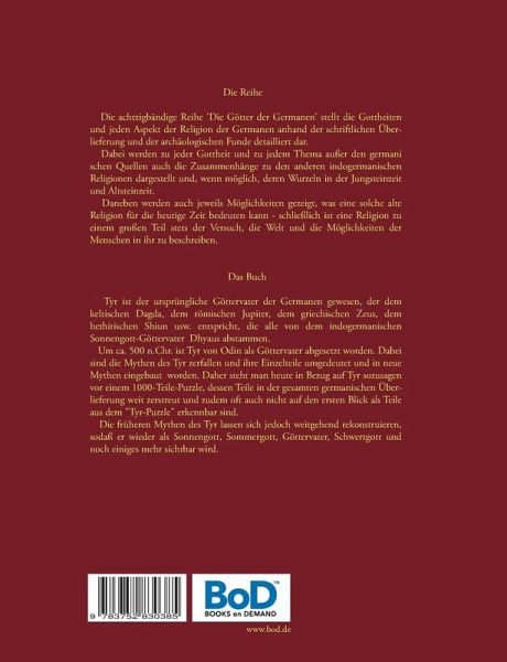 Die ReiheDie achtzigbändige Reihe 'Die Götter der Germanen' stellt die Gottheiten und jeden Aspekt der Religion der Germanen anhand der schriftlichen Überlieferung und der archäologischen Funde detailliert dar.Dabei werden zu jeder Gottheit und zu jedem Thema außer den germanischen Quellen auch die Zusammenhänge zu den anderen indogermanischen Religionen dargestellt und, wenn möglich, deren Wurzeln in der Jungsteinzeit und Altsteinzeit.Daneben werden auch jeweils Möglichkeiten gezeigt, was eine solche alte Religion für die heutige Zeit bedeuten kann - schließlich ist eine Religion zu einem großen Teil stets der Versuch, die Welt und die Möglichkeit der Menschen in ihr zu beschreiben.Das Buch Tyr ist der ursprüngliche Göttervater der Germanen gewesen, der dem keltischen Dagda, dem römischen Jupiter, dem griechischen Zeus, dem hethitischen Shiun usw. entspricht, die alle von dem indogermanischen Sonnengott-Göttervater Dhyaus abstammen.Um ca. 500 n.Chr. ist Tyr von Odin als Göttervater abgesetzt worden. Dabei sind die Mythen des Tyr zerfallen und ihre Einzelteile umgedeutet und in neue Mythen eingebaut worden. Daher steht man heute in Bezug auf Tyr sozusagen vor einem 1000-Teile-Puzzle, dessen Teile in der gesamten germanischen Überlieferung weit zerstreut sind.Die früheren Mythen des Tyr lassen sich jedoch weitgehend rekonstruieren, sodass er wieder als Sonnengott, Sommergott, Göttervater, Schwertgott und noch einiges mehr sichtbar wird.