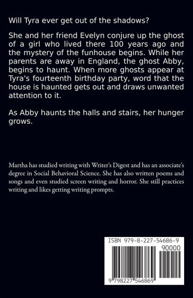 Will Tyra ever get out of the shadows? Growing up isn't easy for Tyra Smythe. Especially when you grow up in a house with shadows. She and her friend Evelyn conjure up the ghost of a girl who lived there 100 years ago and the mystery of the funhouse begins. While her parents are away in England, the ghost Abby, begins to haunt. When more ghosts appear at Tyra's fourteenth birthday party, word that the house is haunted gets out and draws unwanted attention to it. Shortly Margaret has decided it is a good idea to make her home an attraction for some extra money. It is 1949 and more haunted houses are needed, the house is named the Shadows and creepy renovations are started all at the expense of Tim Terror and his haunted attractions company. As Abby the ghost haunts the halls and stairs, her hunger grows. Her legend says she died there and appears during a full moon and she even has a museum room. Abby's heart is close to Tyra, but they must move on though they feel at home again once the remodel of The Shadows is complete.