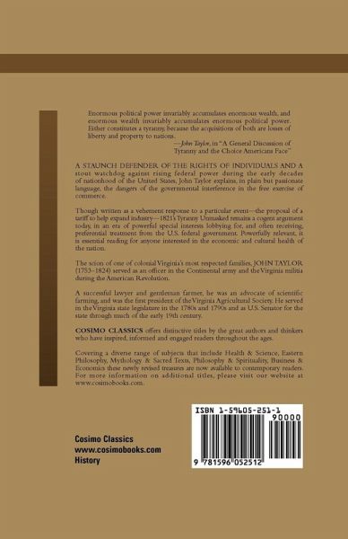 Enormous political power invariably accumulates enormous wealth, and enormous wealth invariably accumulates enormous political power. Either constitutes a tyranny, because the acquisitions of both are losses of liberty and property to nations. -John Taylor, in "A General Discussion of Tyranny and the Choice Americans Face" A staunch defender of the rights of individuals and a stout watchdog against rising federal power during the early decades of nationhood of the United States, John Taylor explains, in plain but passionate language, the dangers of the governmental interference in the free exercise of commerce. Though written as a vehement response to a particular event-the proposal of a tariff to help expand industry-1821's Tyranny Unmasked remains a cogent argument today, in an era of powerful special interests lobbying for, and often receiving, preferential treatment from the U.S. federal government. Powerfully relevant, it is essential reading for anyone interested in the economic and cultural health of the nation. The scion of one of colonial Virginia's most respected families, JOHN TAYLOR (1753-1824) served as an officer in the Continental army and the Virginia militia during the American Revolution. A successful lawyer and gentleman farmer, he was an advocate of scientific farming, and was the first president of the Virginia Agricultural Society. He served in the Virginia state legislature in the 1780s and 1790s and as U.S. Senator for the state through much of the early 19th century.