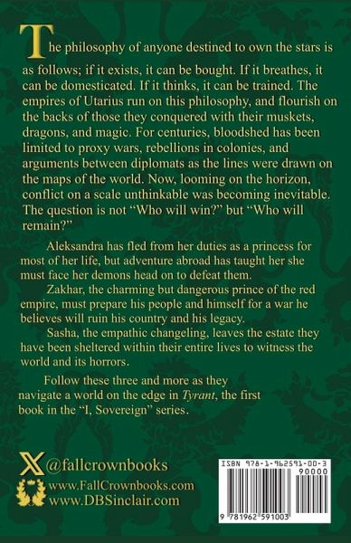 The philosophy of anyone destined to own the stars is as follows; if it exists, it can be bought. If it breathes, it can be domesticated. If it thinks, it can be trained. The empires of Utarius run on this philosophy, and flourish on the backs of those they conquered with their muskets, dragons, and magic. For centuries, bloodshed has been limited to proxy wars, rebellions in colonies, and arguments between diplomats as the lines were drawn on the maps of the world. Now, looming on the horizon, conflict on a scale unthinkable was becoming inevitable. The question is not "Who will win?", but "Who will remain?" Aleksandra has fled from her duties as a princess for most of her life, but adventure abroad has taught her she must face her demons head on to defeat them. Zakhar, the charming but dangerous prince of the red empire, must prepare his people and himself for a war he believes will ruin his country and his legacy. Sasha, the empathic changeling, leaves the estate they have been sheltered within their entire lives to witness the world and its horrors. Follow these three characters and more as they navigate a world of gunpowder and sorcery in D.B.Sinclair's debut novel Tyrant, the first of the "I, Sovereign" series.