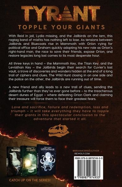 Love and sacrifice, failure and redemption, loss and triumph... it will take everything they have to topple their giants in this spectacular conclusion to the adventure that started it all. With Reid in jail, Lydia missing, and the Jailbirds on the lam, this ragtag band of misfits has nothing left to lose. As tensions between Jailbirds and Bluecoats rise in Mammoth with Orion vying for political office and Graham quickly adopting his new role as Orion's right-hand man, the race to save their friends, expose Orion, and restore legacies long lost comes to its most desperate hour. All three keys in hand - the Mammoth Key, the Titan Key, and the Leviathan Key - the Jailbirds begin their search for Cuvier's lost vault, a trove of discoveries and wonders hidden at the end of a long trail of ciphers and clues. The Wild Hunt closing in on one side and the police on the other, the Jailbirds are running out of time. A new friend and ally leads to a new trail of clues, sending the Jailbirds further than they've ever gone before - to the treacherous desert dunes of Egypt - where defeating Orion Clark and claiming their treasure will force them to face their greatest fears.
