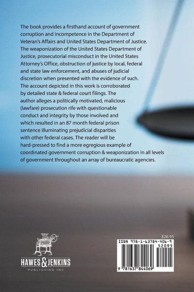 The book provides a firsthand account of government corruption and incompetence in the Department of Veteran's Affairs and United States Department of Justice. The weaponization of the United States Department of Justice, prosecutorial misconduct in the United States Attorney's Office, obstruction of justice by local, federal and state law enforcement, and abuses of judicial discretion when presented with the evidence of such. The account depicted in this work is corroborated by detailed state and federal court filings. The author alleges a politically motivated, malicious (lawfare) prosecution rife with questionable conduct and integrity by those involved and which resulted in an 87 month federal prison sentence illuminating prejudicial disparities with other federal cases. The reader will be hard-pressed to find a more egregious example of coordinated government corruption and weaponization in all levels of government throughout an array of bureaucratic agencies.