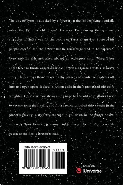 The city of Tyros is attacked by a force from the Imidos planet; and the ruler, the Tyro, is old. Damar becomes Tyro during the war and struggles to find a way for the people of Tyros to survive. Some of his people escape into the desert, but he remains behind to be captured. Tyro and his aids are taken aboard an old space ship. When Tyros explodes, the Imido Commander has to protect himself with a creative story. He destroys those below on the planet and sends the captives off into unknown space locked in prison cells in their unmanned old extra freighter. Only a meteor shower's damage to the old ship allows them to escape from their cells, and from the old crippled ship caught in the planet's gravity. Only three manage to get down to the planet below, and only Tyro lives long enough to join a group of primitives. He becomes the first extraterrestrial.