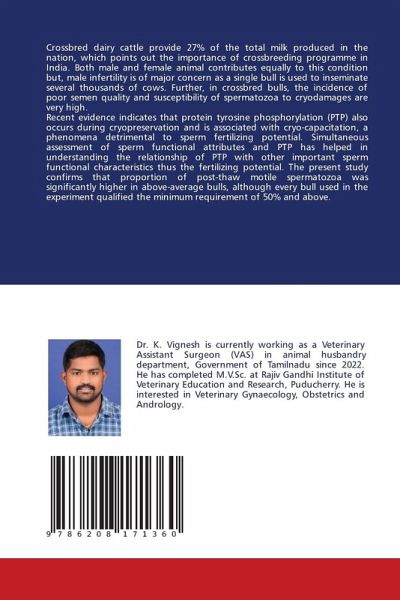 Crossbred dairy cattle provide 27% of the total milk produced in the nation, which points out the importance of crossbreeding programme in India. Both male and female animal contributes equally to this condition but, male infertility is of major concern as a single bull is used to inseminate several thousands of cows. Further, in crossbred bulls, the incidence of poor semen quality and susceptibility of spermatozoa to cryodamages are very high. Recent evidence indicates that protein tyrosine phosphorylation (PTP) also occurs during cryopreservation and is associated with cryo-capacitation, a phenomena detrimental to sperm fertilizing potential. Simultaneous assessment of sperm functional attributes and PTP has helped in understanding the relationship of PTP with other important sperm functional characteristics thus the fertilizing potential. The present study confirms that proportion of post-thaw motile spermatozoa was significantly higher in above-average bulls, although every bull used in the experiment qualified the minimum requirement of 50% and above.