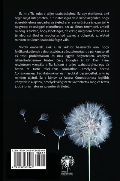 Ez itt a Tíz kulcs a teljes szabadsághoz. Ez egy életforma, ami segít majd kiterjeszteni a tudatosságra való képességeidet, hogy éberebb lehess magadra, az életedre, erre a valóságra és ezen túl. A nagyobb éberséggel elkezdheted azt az életet teremteni, amir¿l mindig is tudtad, hogy lehetséges, de eddig még nem érted el. Ha tényleg csinálod és megtestesíted ezeket a dolgokat, az életed minden területén szabaddá fogsz válni. Voltak emberek, akik a Tíz kulcsot használták arra, hogy felülkerekedjenek a depresszión, a pénztelenségen, a párkapcsolati és testi problémáikon és más egyéb helyzeteken, amelyek leküzdhetetlennek t¿ntek. Gary Douglas és Dr. Dain Heer részletesen vizsgálta a Tíz kulcsot a teljes szabadsághoz egy tíz héten át tartó telekurzus sorozatban, amelyben Access Consciousness Facilitátorokkal és másokkal beszélgettek a világ minden tájáról. Ez a könyv az Access Consciousness legf¿bb irányelvein alapszik, amelyek világszerte változtatták meg és teszik jobbá folyamatosan az emberek életét.