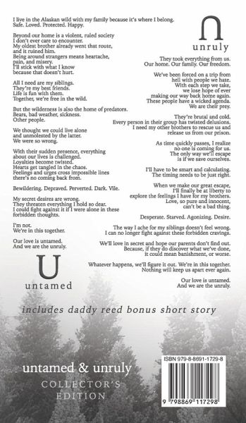 This special edition Paperback includes both The Untamed and The Unruly plus PLUS Bonus story Daddy Reed. The Untamed I live in the Alaskan wild with my family because it's where I belong. Safe. Loved. Protected. Happy. Beyond our home is a violent, ruled society I don't ever care to encounter. My oldest brother already went that route, and it ruined him. Being around strangers means heartache, pain, and misery. I'll stick with what I know because that doesn't hurt. All I need are my siblings. They're my best friends. Life is fun with them. Together, we're free in the wild. But the wilderness is also the home of predators. Bears, bad weather, sickness. Other people. We thought we could live alone and unmolested by the latter. We were so wrong. With their sudden presence, everything about our lives is challenged. Loyalties become twisted. Hearts get tangled in the chaos. Feelings and urges cross impossible lines there's no coming back from. Bewildering. Depraved. Perverted. Dark. Vile. My secret desires are wrong. They threaten everything I hold so dear. I could fight against it if I were alone in these forbidden thoughts. I'm not. We're in this together. Our love is untamed. And we are the unruly. *** The Unruly They took everything from us. Our home. Our family. Our freedom. We've been forced on a trip from hell with people we hate. With each step we take, we lose hope of ever making our way back home again. These people have a wicked agenda. We are their prey. They're brutal and cold. Every person in their group has twisted delusions. I need for my other brothers to rescue us and release us from our prison. As time quickly passes, I realize no one is coming for us. The only way we'll escape is if we save ourselves. I'll have to be smart and calculating. The timing needs to be just right. When we make our great escape, I'll finally be at liberty to explore the feelings I have for my brothers. Love, so pure and innocent, can't be a bad thing. Desperate. Starved. Agonizing. Desire. The way I ache for my siblings doesn't feel wrong. I can no longer fight against these forbidden cravings. We'll love in secret and hope our parents don't find out. Because, if they do discover what we've done, it could mean banishment, or worse. Whatever happens, we'll figure it out. We're in this together. Nothing will keep us apart ever again. Our love is untamed. And we are the unruly. ***The Untamed and The Unruly is a second generation forbidden romance in the Wild World taking place on the timeline after The Wild and The Free. While it's not necessary to have read the other two books, please note these characters are the children of Daddy Reed from The Wild. You'll see all of the characters from The Wild and The Free in The Untamed and The Unruly. Please read trigger warnings before proceeding.***