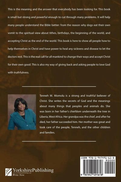 This is the meaning and the answer that everybody has been looking for. This book is small but strong and powerful enough to cut through many problems. It will help many people understand the Bible better: from the reason why dogs eat their own vomit to the spiritual view about tithes, birthdays, the beginning of the world, and accepting Christ as the end of the world. This book is here to show all people how to help themselves in Christ and have power to heal any sickness and disease to let the doctors rest. This is the real call for all mankind to change their ways and accept Christ for their own good. This is also my way of giving back and asking people to love God with truthfulness.