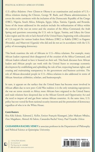 U.S.–Africa Relations: From Clinton to Obama examines political, economic, and cultural relations between the United States and Africa during the Clinton, George W. Bush, and Obama administrations within the context of the post–Cold War era and the emergence of the war on terror. The book's contributors argue that each administration, despite changing the names of their policies toward Africa, continued to evaluate their policies based on U.S. national interests—democracy, economic interests (oil and gas), and security—particularly following the September 11 terrorist attacks.