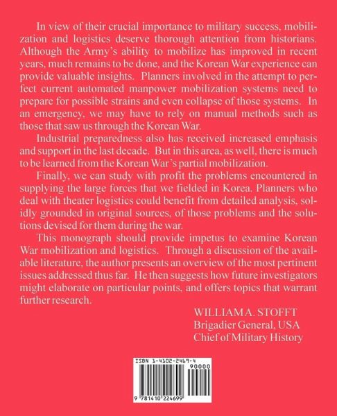In view of their crucial importance to military success, mobilization and logistics deserve thorough attention from historians. Although the Army's ability to mobilize has improved in recent years, much remains to be done, and the Korean War experience can provide valuable insights. Planners involved in the attempt to perfect current automated manpower mobilization systems need to prepare for possible strains and even collapse of those systems. In an emergency, we may have to rely on manual methods such as those that saw us through the Korean War. Industrial preparedness also has received increased emphasis and support in the last decade. But in this area, as well, there is much to be learned from the Korean War's partial mobilization. Finally, we can study with profit the problems encountered in supplying the large forces that we fielded in Korea. Planners who deal with theater logistics could benefit from detailed analysis, solidly grounded in original sources, of those problems and the solutions devised for them during the war. This monograph should provide impetus to examine Korean War mobilization and logistics. Through a discussion of the available literature, the author presents an overview of the most pertinent issues addressed thus far. He then suggests how future investigators might elaborate on particular points, and offers topics that warrant further research. WILLIAM A. STOFFT Brigadier General, USA Chief of Military History
