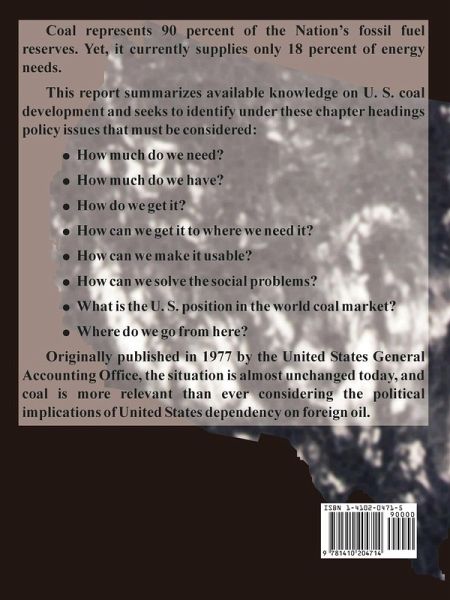 Coal represents 90 percent of the Nation's fossil fuel reserves. Yet, it currently supplies only 18 percent of energy needs. This report summarizes available knowledge on U. S. coal development and seeks to identify under these chapter headings policy issues that must be considered: How much do we need? How much do we have? How do we get it? How can we get it to where we need it? How can we make it usable? How can we solve the social problems? What is the U. S. position in the world coal market? Where do we go from here? Originally published in 1977 by the United States General Accounting Office, the situation is almost unchanged today, and coal is more relevant than ever considering the political implications of United States dependency on foreign oil.