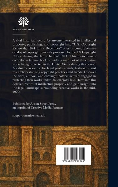 A vital historical record for anyone interested in intellectual property, publishing, and copyright law, "U.S. Copyright Renewals, 1974 July - December" offers a comprehensive catalog of copyright renewals processed by the US Copyright Office during the latter half of 1974. This meticulously compiled reference book provides a snapshot of the creative works being protected in the United States during this period. A valuable resource for legal professionals, historians, and researchers studying copyright practices and trends. Discover the titles, authors, and copyright holders actively engaged in protecting their works under United States law. Delve into this detailed record of intellectual property and gain insight into the legal landscape surrounding creative works in the mid-1970s. This work has been selected by scholars as being culturally important, and is part of the knowledge base of civilization as we know it. This work is in the public domain in the United States of America, and possibly other nations. Within the United States, you may freely copy and distribute this work, as no entity (individual or corporate) has a copyright on the body of the work. Scholars believe, and we concur, that this work is important enough to be preserved, reproduced, and made generally available to the public. We appreciate your support of the preservation process, and thank you for being an important part of keeping this knowledge alive and relevant.