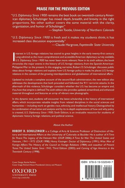 Interest in U.S. foreign relations has soared to great heights in the early twenty-first century. Long admired as the most comprehensive and accessible American diplomacy survey available, U.S. Diplomacy Since 1900 has never been more relevant. Now in its sixth edition, the book chronicles the major events in the history of U.S. foreign relations, from the Spanish-American-Philippine War to the present. In this engaging narrative, Robert D. Schulzinger discusses public ideas about foreign relations and explains how U.S. foreign policy is made; he places U.S. foreign relations in the context of the growing interdependence and globalization of international affairs. Updated to include a complete account of the second Bush administration, the new edition also addresses the developments that both preceded and followed the 9/11 terrorist attacks. In the aftermath of this violence, Schulzinger considers whether the U.S. has become an empire and, if so, how that empire is defined. The sixth edition also provides updated, streamlined, and enhanced material throughout and features an array of vibrant new photographs. In this dynamic text, students will encounter the latest scholarship in the history of international affairs, which incorporates valuable insights from related disciplines in the social sciences and humanities--including work on gender, race, ethnicity, and intellectual history. Distinguished by its combination of narrative and analysis and by its in-depth explanations of how and why policy is created, U.S. Diplomacy Since 1900, Sixth Edition, is an invaluable resource for students of diplomatic history, foreign relations, and political science.