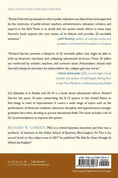 Richard W. Garrett PhD has been studying the U.S. public education system for 10 years and has concluded that major reforms are needed. This is his second book on this subject area. In 2017 he published: The Kids Are Smart Enough, So What's the Problem? This new book is much more comprehensive with its 17 chapters touching on many diverse topics. What is unique about the new book is the set of 22 recommendations to improve the system.