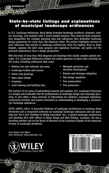 State-by-state listings and explanations of municipal landscape ordinances In U.S. Landscape Ordinances, Buck Abbey furnishes landscape architects, planners, land-use attorneys, and students with a much-needed resource. This state-by-state presentation demystifies the complex planning laws and ordinances that determine landscape design parameters for more than 300 American cities. The author highlights sections of each ordinance that pertain to landscape architecture, boils the legalese down to plain English, explains the law's main purpose and regulatory function, and spells out the practical implications from a design perspective. With the help of more than fifty diagrams and drawings that clarify complex spatial concepts, U.S. Landscape Ordinances reviews the entire spectrum of green laws currently on the books, including ordinances that cover: * Parking lots and vehicular use areas * Landscape buffers and screens * Street tree plantings * Open space design * Irrigation * Land clearing and building sites The product of ten years of painstaking research and analysis, U.S. Landscape Ordinances is a unique and invaluable tool for professionals in landscape design and municipal planning. It also offers a deep reservoir of information for students, municipal legislators, community activists, and anyone interested in understanding or developing a community's landscape ordinances.