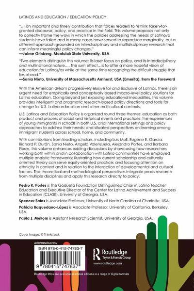 CONTENTS Foreword Sonia Nieto Editors' Introduction Section I: Policy Concerns about Praxis and Cultural Capital Preservation Chapter 1 National Myopia, Latino Futures, and Educational PolicyPedro R. Portes & Spencer Salas Chapter 2 Thinking through the Decolonial Turn in Research and Praxis: Advancing New Understandings of the Community-School Relation in Latina/o Parent InvolvementPatricia Baquedano-López, Sera J. Hernandez & Rebecca A. Alexander Chapter 3 Cultivating a Cadre of Critically Conscious Teachers and "Taking this Country to a Totally New Place"Angela Valenzuela & Patricia D. López Section II: Children of Immigrants in Schools: Global and U.S. Policy Research Chapter 4 Immigration and the American School System: The Second Generation at the CrossroadsAlejandro Portes Chapter 5 Divergent Paths to School Adaptation among Children of Immigrants: New Approaches and Insights to Existing DataCecilia Rios-Aguilar, Manuel S. Gonzalez Canché, & Pedro R. Portes Chapter 6 Recommendations from a Comparative Analysis of Educational Policies and Research for the Achievement of Latinos in the U. S. and Latin Americans in Spain towards Smarter Solutions Martha Montero-Sieburth & Lidia Cabrera Perez Chapter 7 Development and its social, economic, and educational consequences: The case of the Zimapán Hydroelectric Project Sergio Quesada Aldana Chapter 8 Transnational Mobility, Education and Subjectivity: Two Case Examples from Puerto RicoSandra Soto-Santiago & Luis C. Moll Section III: A Closer Look at Families, Classroom Learning, and Identity Development Chapter 9 Finding a Place: Migration and Education in Mixed-Status FamiliesAriana Mangual Figueroa Chapter 10 Talking the Walk: Classroom Discourse Strategies that Foster Dynamic Interactions with Latina/o Elementary School English LearnersRuth Harman Chapter 11 Changing the Pedagogical Culture of Schools with Latino English Learners: Re-culturing Instructional LeadershipNoni Mendoza Reis & Barbara Flores Chapter 12 Beyond Educational Standards? Latino Student Learning Agency and Identity in ContextRichard P. Durán Afterword Eugene E. García Contributors