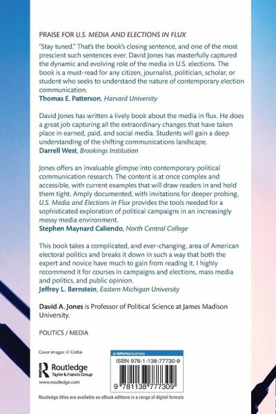 Paid, earned, and social media are all crucial elements of modern electioneering, yet there is a scarcity of supplementary texts for campaigns and election courses that cover all types of media. Equally, media and politics courses cover election-related topics, yet there are few books that cover these subjects comprehensively. This brief and accessible book bridges the gap by discussing media in the context of U.S elections. David A. Jones divides the book into two parts, with the first analyzing the wide array of media outlets citizens use to inform themselves during elections. Jones covers traditional, mainstream news media and opinion/entertainment-based media, as well as new media outlets such as talk shows, blogs, and late-night comedy programs. The second half of the book assesses how campaigns and candidates have adapted to the changing media environment. These chapters focus on earned media strategies, paid media strategies, and social media strategies. Written in a concise and accessible style while including recent scholarly research, the book will appeal to students with its combination of academic rigor and readability. U.S. Media and Elections in Flux will be a useful supplementary textbook for courses on campaigns and elections, media and politics, and American introductory politics.