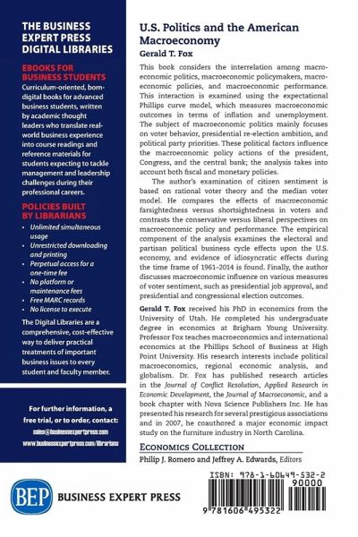 This book considers the interrelation among macroeconomic politics, macroeconomic policymakers, macroeconomic policies, and macroeconomic perform ance. This interaction is examined using the expectational Phillips curve model, which measures macroeconomic outcomes in terms of inflation and unemployment. The subject of macroeconomic politics mainly focuses on voter behavior, presidential reelection ambition, and political party priorities. These political factors influence the macroeconomic policy actions of the president, Congress, and the central bank; the analysis takes into account both fiscal and monetary policies. The author's examination of citizen sentiment is based on rational voter theory and the median voter model. He compares the effects of macroeconomic farsightedness versus shortsightedness in voters and contrasts the conservative versus liberal perspectives on macroeconomic policy and performance. The empirical component of the analysis examines the electoral and partisan political business cycle effects upon the U.S. economy, and evidence of idiosyncratic effects during the time frame of 1961-2014 is found. Finally, the author discusses macroeconomic influence on various measures of voter sentiment, such as presidential job approval, and presidential and congressional election outcomes.
