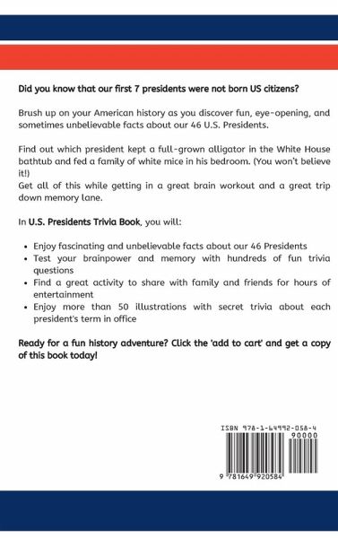 Did you know that our first 7 presidents were not born US citizens? Brush up on your American history as you discover fun, eye-opening, and sometimes unbelievable facts about our 46 U.S. Presidents. Find out which president kept a full-grown alligator in the White House bathtub and fed a family of white mice in his bedroom. (You won't believe it!) Get all of this while getting in a great brain workout and a great trip down memory lane. In U.S. Presidents Trivia Book, you will:Enjoy fascinating and unbelievable facts about our 46 Presidents Test your brainpower and memory with hundreds of fun trivia questions Find a great activity to share with family and friends for hours of entertainment Enjoy more than 50 illustrations with secret trivia about each president's term in office Ready for a fun history adventure? Click the 'add to cart' and get a copy of this book today!
