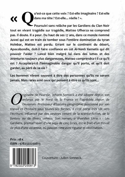 « Qu'est-ce que cette voix ? Est-elle imaginaire ? Est-elle dans ma tête ? Est-elle... réelle ? ».Poursuivi sans relâche par les Gardiens du Clan Noir tout en vivant tragédie sur tragédie, Matteo Ufherza ne comprend pas. Il doute. Il a peur. Du haut de ses 17 ans, dans ce monde nommé Juwei qui est en train de tomber sous l'entière domination du tyran Holnbar, Matteo est perdu. Errant sur le continent du désert, Apocobondie, doit-il faire confiance en cet Al-Nenh Kemetis qui dit pouvoir l'aider ? Lancé bien malgré lui dans des luttes et des aventures toujours plus dangereuses, Matteo comprendra-t-il ce qu'il est ? Acceptera-t-il l'inimaginable danger qu'il porte, et qu'il doit garder, au péril de sa vie ?Les hommes rêvent souvent à être des personnes qu'ils ne seront jamais. Mais rares sont ceux qui pensent à être ce qu'ils sont...