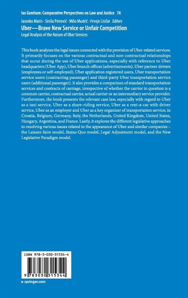 This book analyzes the legal issues connected with the provision of Uber-related services. It primarily focuses on the various contractual and non-contractual relationships that occur during the use of Uber applications, especially with reference to Uber headquarters (Uber App), Uber branch offices (advertisements), Uber partner drivers (employees or self-employed), Uber application registered users, Uber transportation service users (contracting passenger) and third-party Uber transportation service users (additional passenger). It also provides a comparison of standard transportation services and contracts of carriage, irrespective of whether the carrier in question is a common carrier, contractual carrier, actual carrier or an intermediary service provider. Furthermore, the book presents the relevant case law, especially with regard to Uber as a taxi service, Uber as a share-riding service, Uber as a rent-a-car with driver service, Uber as an employer and Uber as a key organizerof transportation service, in Croatia, Belgium, Germany, Italy, the Netherlands, United Kingdom, United States, Hungary, Argentina, and France. Lastly, it explores the different legislative approaches to resolving various issues related to the appearance of Uber and similar companies - the Laissez-faire model, Status Quo model, Legal Adjustment model, and the New Legislative Paradigm model.