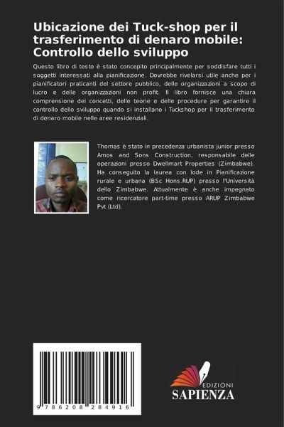 Questo libro di testo è stato concepito principalmente per soddisfare tutti i soggetti interessati alla pianificazione. Dovrebbe rivelarsi utile anche per i pianificatori praticanti del settore pubblico, delle organizzazioni a scopo di lucro e delle organizzazioni non profit. Il libro fornisce una chiara comprensione dei concetti, delle teorie e delle procedure per garantire il controllo dello sviluppo quando si installano i Tuckshop per il trasferimento di denaro mobile nelle aree residenziali.