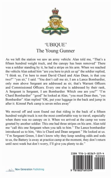 'UBIQUE' The Young Gunner As we left the station we saw an army vehicle. Alan told me, "That's a fifteen hundred weight truck, and the canopy has been removed" There was a soldier standing by it, he had a stripe on his arm. When we reached the vehicle Alan asked him "are you here to pick us up" the soldier replied, "I think so, I'm here to meet David Chard and Alan Dean, is that you two?" "yes sir," I said. "You don't call me sir, I am a Lance Bombardier, only men above Sergeant are addressed as sir, that's Warrant Officers and Commissioned Officers. Every one else is addressed by their rank, A Sergeant is Sergeant, I am Bombardier. Which one are you?" "I'm Chard Bombardier" "good" he looked at Alan, "you must Dean then, "yes Bombardier" Alan replied "OK, put your luggage in the back and jump in after it. Kimnel Park camp is seven miles away" We moved off and soon found out that riding in the back of a fifteen hundred weight truck is not the most comfortable way to travel, especially when there was no canopy on it. When we arrived at the camp we were greeted by another soldier. This one had three stripes on his arm. Alan told me "call this one Sergeant when you talk to him." The Lance bombardier introduced us to him, "this is Chard and Dean sergeant." He looked at us. "I'm Sergeant Green, I don't know why they keep sending odds and sods to us, the Battery is away at practice camp at the moment, they don't return until next week but don't worry, I'll give you plenty to do."