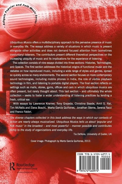 Ubiquitous Musics offers a multidisciplinary approach to the pervasive presence of music in everyday life. The essays address a variety of situations in which music is present alongside other activities and does not demand focused attention from (sometimes involuntary) listeners. The contributors present different theoretical perspectives on the increasing ubiquity of music and its implications for the experience of listening. The collection consists of nine essays divided into three sections: Histories, Technologies, and Spaces. The first section addresses the historical origins of functional music and the debates on how reproduced music, including a wide range of styles and genres, spread so quickly across so many environments. The second section focuses on more contemporary sound technologies, including mobile phones in India, the role of visible playback technology in film, and listening to portable digital players. The final section reflects on settings such as malls, stores, gyms, offices and cars in which ubiquitous musics are often present, but rarely thought about. This last section - and ultimately the whole collection - seeks to foster a wider understanding of listening practices by lending a fresh, critical ear.