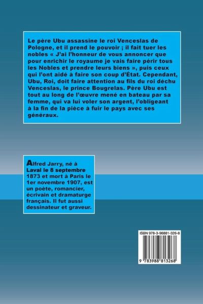 Le père Ubu assassine le roi Venceslas de Pologne, et il prend le pouvoir ; il fait tuer les nobles J'ai l'honneur de vous annoncer que pour enrichir le royaume je vais faire périr tous les Nobles et prendre leurs biens , puis ceux qui l'ont aidé à faire son coup d'État. Cependant, Ubu, Roi, doit faire attention au fils du roi déchu Venceslas, le prince Bougrelas. Père Ubu est tout au long de l'uvre mené en bateau par sa femme, qui va lui voler son argent, l'obligeant à la fin de la pièce à fuir le pays avec ses généraux.