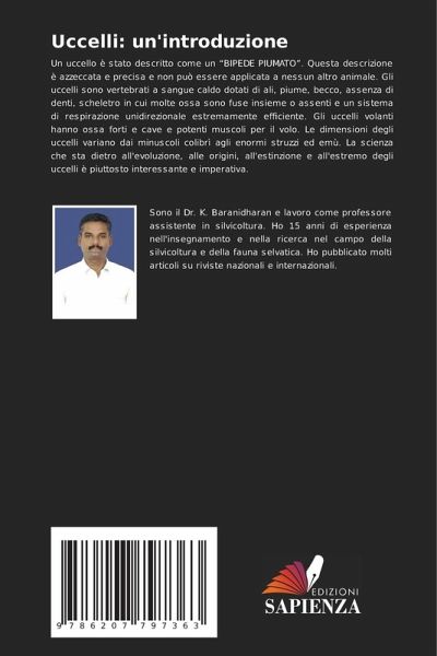 Un uccello è stato descritto come un ¿BIPEDE PIUMATO¿. Questa descrizione è azzeccata e precisa e non può essere applicata a nessun altro animale. Gli uccelli sono vertebrati a sangue caldo dotati di ali, piume, becco, assenza di denti, scheletro in cui molte ossa sono fuse insieme o assenti e un sistema di respirazione unidirezionale estremamente efficiente. Gli uccelli volanti hanno ossa forti e cave e potenti muscoli per il volo. Le dimensioni degli uccelli variano dai minuscoli colibrì agli enormi struzzi ed emù. La scienza che sta dietro all'evoluzione, alle origini, all'estinzione e all'estremo degli uccelli è piuttosto interessante e imperativa.