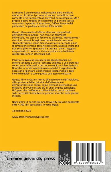 La routine è un elemento indispensabile della medicina moderna. Struttura i processi di lavoro, crea efficienza e consente il funzionamento di sistemi di cura complessi. Ma è proprio questa routine che nasconde un pericolo spesso trascurato: la perdita di attenzione, l'affievolimento del particolare, la graduale erosione dell'empatia. Questo libro esamina l'effetto silenzioso ma profondo dell'indifferenza medica, non come un fallimento individuale, ma come un fenomeno sistemico. Mostra come i vincoli strutturali, le logiche economiche e la crescente standardizzazione stiano facendo passare in secondo piano la dimensione umana dell'arte della cura. Diventa chiaro che non sono gli errori spettacolari a causare i danni maggiori, ma piuttosto il trascurare, il non ascoltare e la frettolosa categorizzazione in schemi già noti. L'autrice si avvale di un'esperienza pluridecennale nel settore sanitario e unisce l'acutezza analitica a una profonda conoscenza della pratica del lavoro medico e infermieristico. Dimostra in modo impressionante perché è urgentemente necessario ripensare la dimensione interpersonale degli incontri medici - e come questo può essere realizzato. Questo libro invoca un ritorno alla percezione dell'individuo, all'importanza della curiosità, dell'attenzione e dell'autoriflessione critica, come elementi essenziali di una medicina che vuole essere più di una semplice tecnologia. Un'opera che fa riflettere sui limiti delle cure di routine e sulla necessità di rimettere le persone al centro della pratica medica. Negli ultimi 11 anni la Bremen University Press ha pubblicato oltre 4.700 libri specialistici in varie lingue.