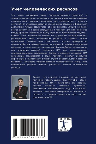 Jeta kniga poswqschena uchetu "intellektual'nogo kapitala" w chelowecheskih resursah, poskol'ku w nastoqschee wremq mnogie kompanii stradaüt iz-za nehwatki sotrudnikow dlq samorazwitiq, a inogda u kompanij net strategii razwitiq chelowecheskih resursow w firmah dlq dostizheniq luchshih rezul'tatow wo wseh aspektah. Luchshie kompanii wsegda zabotqtsq o swoih sotrudnikah i prowodqt dlq nih mnozhestwo mezhdunarodnyh treningow po wsemu miru. Uchet chelowecheskih resursow - wazhnyj aktiw organizacii. Odnako ne suschestwuet zakonodatel'nogo regulirowaniq ucheta chelowecheskih resursow w godowyh otchetah organizacij. Osnownaq cel' ätoj knigi - izuchit' preimuschestwa praktiki HRA dlq proizwoditel'nosti firmy. V dannom issledowanii osweschaütsq teoreticheskie opredeleniq HRA i problemy, woznikaüschie pri wnedrenii modelej izmereniq HRA dlq prognozirowaniq proizwoditel'nosti organizacii. Odnako w processe wnedreniq HRA organizacii stalkiwaütsq s rqdom problem. Poskol'ku raskrytie informacii o chelowecheskih aktiwah sluzhit dokazatel'stwom sozdaniq bogatstwa, nekotorye predprinimateli soprotiwlqütsq ätomu. Uchet chelowecheskih resursow pomogaet rasschitat' kapital chelowecheskih resursow.
