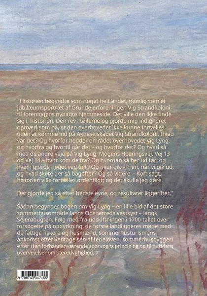 "Historien begyndte som noget helt andet, nemlig som et jubilæumsportræt af Grundejerforeningen Vig Strandkoloni til foreningens nybagte hjemmeside. Det ville den ikke finde sig i, historien. Den rev i tøjlerne og gjorde mig indigneret opmærksom på, at den overhovedet ikke kunne fortælles uden at komme ind på Aktieselskabet Vig Strandkoloni. Hvad var det? Og hvorfor hedder området overhovedet Vig Lyng, og hvorfra og hvortil går det - og hvorfor det? Og hvad så med de andre veje på Vig Lyng, Mogens Heeringsvej, Vej 13 og Vej 14 - hvor kom de fra? Og hvordan så her ud før, og hvem gjorde noget ved det? Og hvor gik vi hen, når vi gik ud, og hvad skete der så bagefter? Og så videre. Kort sagt, historien ville fortælles ordentligt; og det skulle jeg gøre. Det gjorde jeg så efter bedste evne, og resultatet ligger her." Sådan begynder bogen om Vig Lyng - en lille bid af det store sommerhusområde langs Odsherreds vestkyst - langs Sejerøbugten. Følg med fra udskiftningen i 1700-tallet over forsøgene på opdyrkning, de første landliggeres møde med de forarmede fiskere og husmænd, masse-sommerhusturismens ankomst efter vedtagelsen af ferieloven og op til nutidens overvejelser om bæredygtighed. De fire små sommerhusveje på Vig Lyng er på godt og ondt (men mest godt!) et spejlbillede af hele den danske sommerhusbevægelses tilbliven, og alle sommerhusejere vil på den ene eller den anden måde kunne spejle sig i historien her. Læs med - og bliv inspireret til at grave I jeres egen vejs historie!