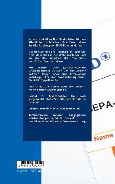 Jeder Haushalt zahlt in Deutschland für den öffentlich-rechtlichen Rundfunk einen Rundfunkbeitrag von 18,36 Euro im Monat.Der Beitrag fällt pro Haushalt an, egal wie viele Menschen in der Wohnung leben und ob sie das Angebot der öffentlich-rechtlichen Sender nutzen.Aus sozialen oder gesundheitlichen Gründen kannst Du Dich von der Gebühr befreien lassen oder eine Ermäßigung beantragen. Für eine Zweitwohnung musst Du nicht doppelt zahlen.Was bringt Dir selbst aber das Zahlen? Welche guten Gründe gibt es. Herold zu Moschdehner hat sich aufgemacht, diese Vorteile und Gründe zu sammeln. Die Resultate findest Du in diesem Buch. "Informationen müssen ausgegraben werden. Das geht nicht für umsonst"Herold zu Moschdehner - Presseratssitzung 2021