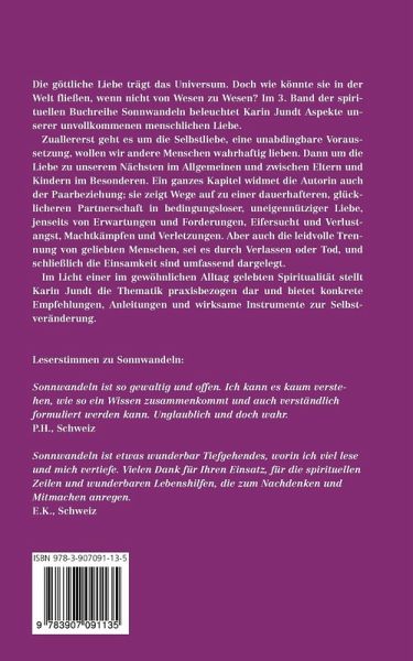 Die göttliche Liebe trägt das Universum. Doch wie könnte sie in der Welt fliessen, wenn nicht von Wesen zu Wesen? Im 3. Band der spirituellen Buchreihe Sonnwandeln beleuchtet Karin Jundt Aspekte unserer unvollkommenen menschlichen Liebe. Zuallererst geht es um die Selbstliebe, eine unabdingbare Voraussetzung, wollen wir andere Menschen wahrhaftig lieben. Dann um die Liebe zu unserem Nächsten im Allgemeinen und zwischen Eltern und Kindern im Besonderen. Ein ganzes Kapitel widmet die Autorin auch der Paarbeziehung; sie zeigt Wege auf zu einer dauerhafteren, glücklicheren Partnerschaft in bedigungsloser, uneigennütziger Liebe, jenseits von Erwartungen und Forderungen, Eifersucht und Verlustangst, Machtkämpfen und Verletzungen. Aber auch die leidvolle Trennung von geliebten Menschen, sei es durch Verlassen oder Tod, und schliesslich die Einsamkeit sind umfassend dargelegt. Im Licht einer im gewöhnlichen Alltag gelebten Spiritualität stellt Karin Jundt die Thematik praxisbezogen dar und bietet konkrete Empfehlungen, Anleitungen und wirksame Instrumente zur Selbstveränderung. Inhaltsverzeichnis: Einleitung Auf dem Sonnwandeln-Weg 1. Liebe deinen Nächsten wie dich selbst 2. Nächstenliebe - doch das oberste Gebot? 3. Muss ich Vater und Mutter unbedingt ehren? 4. Liebe ist kein Deal. 5. Scheiden tut weh! Trennung und Tod 6. Einsamkeit und Alleinsein Ein ganz kurzes Schlusswort