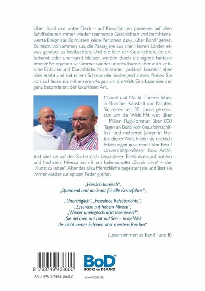 Über Bord und unter Deck - auf Kreuzfahrten passieren auf allenSchiffsebenen immer wieder spannende Geschichten und berichtenswerteEreignisse. Es müssen keine Personen dazu über Bord gehen.Es reicht vollkommen aus, die Passagiere aus aller Herren Länder etwasgenauer zu beobachten. Und die Teile der Geschichten, die unbekanntoder unerkannt bleiben, werden durch die eigene Fantasieersetzt: So ergeben sich immer wieder unterhaltsame, aber auch kritischeEinblicke und Durchblicke. Nicht immer politisch korrekt, aberalles erlebt und mit einem Schmunzeln niedergeschrieben. Reisen Sievon zu Hause aus mit unseren Augen um die Welt. Eine Lesereise derganz besonderen, der luxuriösen Art.