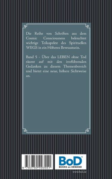 Die Reihe von Schriften aus dem Cosmic Consciousness beleuchtet wichtige Teilaspekte des Spirituellen WEGS in ein Höheres Bewusstsein. Band 5 - Über das LEBEN ohne Tod räumt auf mit den irreführenden Gedanken zu diesem Themenbereich und bietet eine neue, höhere Sichtweise an.