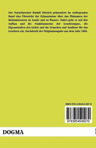 Der Naturforscher Rudolf Dittrich präsentiert im vorliegenden Band eine Übersicht der Erkenntnisse über das Phänomen der Biolumineszenz zu Lande und zu Wasser. Dabei geht er auf den Aufbau und die Funktionsweise der Leuchtorgane, die Eigenschaften des Lichts und die Ursachen und Auslöser für das Leuchten ein. Nachdruck der Originalausgabe aus dem Jahr 1888.