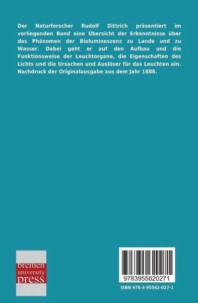 Der Naturforscher Rudolf Dittrich präsentiert im vorliegenden Band eine Übersicht der Erkenntnisse über das Phänomen der Biolumineszenz zu Lande und zu Wasser. Dabei geht er auf den Aufbau und die Funktionsweise der Leuchtorgane, die Eigenschaften des Lichts und die Ursachen und Auslöser für das Leuchten ein. Nachdruck der Originalausgabe aus dem Jahr 1888.
