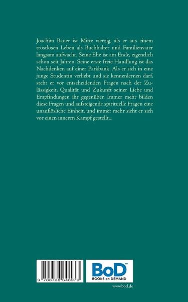 Joachim Bauer ist Mitte vierzig, als er aus einem trostlosen Leben als Buchhalter und Familienvater langsam aufwacht. Seine Ehe ist am Ende, eigentlich schon seit Jahren. Seine erste freie Handlung ist das Nachdenken auf einer Parkbank. Als er sich in eine junge Studentin verliebt und sie kennenlernen darf, steht er vor entscheidenden Fragen nach der Zulässigkeit, Qualität und Zukunft seiner Liebe und Empfindungen ihr gegenüber. Immer mehr bilden diese Fragen und aufsteigende spirituelle Fragen eine unauflösliche Einheit, und immer mehr sieht er sich vor einen inneren Kampf gestellt...