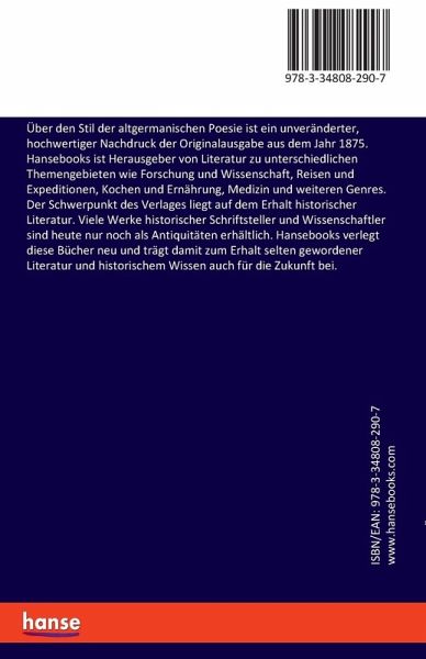 Über den Stil der altgermanischen Poesie ist ein unveränderter, hochwertiger Nachdruck der Originalausgabe aus dem Jahr 1875.Hansebooks ist Herausgeber von Literatur zu unterschiedlichen Themengebieten wie Forschung und Wissenschaft, Reisen und Expeditionen, Kochen und Ernährung, Medizin und weiteren Genres. Der Schwerpunkt des Verlages liegt auf dem Erhalt historischer Literatur. Viele Werke historischer Schriftsteller und Wissenschaftler sind heute nur noch als Antiquitäten erhältlich. Hansebooks verlegt diese Bücher neu und trägt damit zum Erhalt selten gewordener Literatur und historischem Wissen auch für die Zukunft bei.