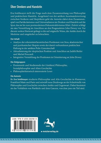 Eva Seidlmayer stellt die Frage nach dem Zusammenhang von Philosophie und praktischem Handeln. Ausgehend von der antiken Auseinandersetzung zwischen Stoikern und Skeptikern geht die Autorin dabei dem Zusammenspiel von Partikularismus und Universalismus im Denken und Handeln auf die Spur, das sie bis zum postmodernen Dekonstruktivismus führt. Zuletzt schlägt sie eine Vermittlung im Anschluss an den Pragmatisten John Dewey vor. Vor diesem weiten Horizont gelingt es ihr auf originelle Weise, die Antike durch die Moderne und umgekehrt zu beleuchten.