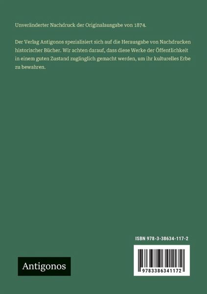 Unveränderter Nachdruck der Originalausgabe von 1874. Der Verlag Antigonos spezialisiert sich auf die Herausgabe von Nachdrucken historischer Bücher. Wir achten darauf, dass diese Werke der Öffentlichkeit in einem guten Zustand zugänglich gemacht werden, um ihr kulturelles Erbe zu bewahren.