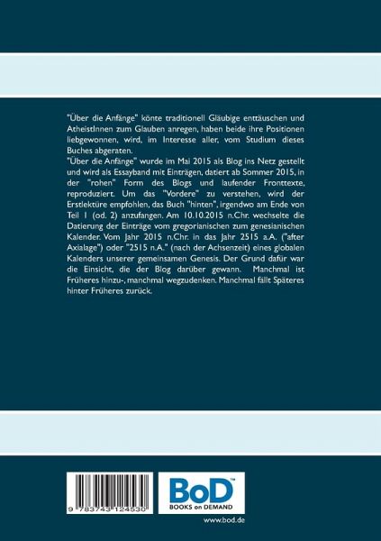"Über die Anfänge" könnte traditionell Gläubige enttäuschen und AtheistInnen zum Glauben anregen, haben beide ihre Positionen liebgewonnen, wird, im Interesse aller, vom Studium dieses Buches abgeraten. "Über die Anfänge" wurde 2015 als Blog ins Netz gestellt, und wird, datiert ab Sommer 2015, in der rohen Form des Blogs und laufender, d.h. nach "hinten" verschwindender, Frontexte, bis Februar 2017 reproduziert. Um das "Vordere" zu verstehen, wird daher der Erstlektüre empfohlen, am Ende von Teil 1 (od. 2, Teil 2 mit Register) des Buches zu beginnen. Am 10.10.2015 n.C. wechselt die Datierung der Einträge vom gregorianischen zum genesianischen Kalender, in das Jahr 2515 a.A. (after Axialage) oder 2515.n.A. (nach der Achsenzeit) eines globalen Zeitkalenders unserer gemeinsamen Genesis. Eine redigierte und erweiterte Neuauflage ist geplant, der entsprechende Aufwand wird auch eine andere Preisgestaltung mit sich bringen, diese "rohe" Version verkauft der Autor so günstig wie möglich.