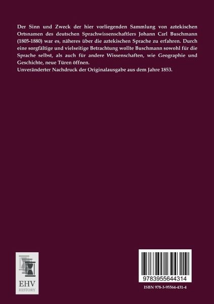 Der Sinn und Zweck der hier vorliegenden Sammlung von aztekischen Ortsnamen des deutschen Sprachwissenschaftlers Johann Carl Buschmann (1805-1880) war es, näheres über die aztekischen Sprache zu erfahren. Durch eine sorgfältige und vielseitige Betrachtung wollte Buschmann sowohl für die Sprache selbst, als auch für andere Wissenschaften, wie Geographie und Geschichte, neue Türen öffnen. Unveränderter Nachdruck der Originalausgabe aus dem Jahre 1853.